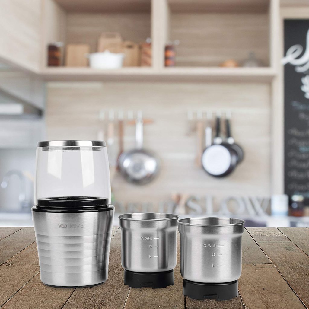 Ce moulin à café de la marque VeoHome est un excellent choix. En effet, il est électrique et sera parfait pour moudre du café mais aussi tout autre type d’épice. Vous pouvez l’utiliser facilement en appuyant dessus. En plus de la machine, vous aurez 2 couvercles offerts avec des lames différentes. Vous pouvez l’utiliser plus ou moins longtemps en fonction de l’épaisseur souhaitée des grains. Le moulin VeoHome est très sécurisé et vous ne pouvez pas vous couper. Il est facilement lavable et vous pouvez vous faire rembourser dans les 30 jours si vous changez d’avis.
